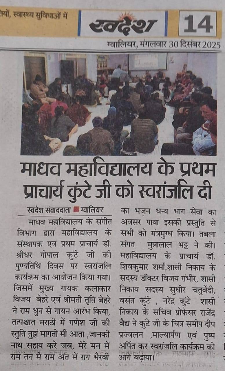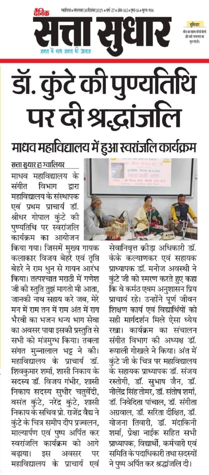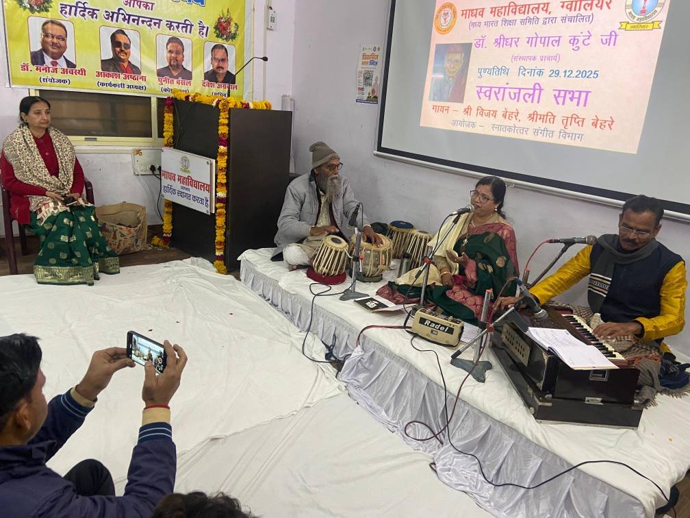 दिनांक 29 .12 .2024 को मध्य भारत शिक्षा समिति द्वारा संचालित माधव महाविद्यालय के संस्थापक एवं प्राचार्य आचार्य डॉ श्रीधर गोपाल कुंटे जी की पुण्य स्मृति दिवस पर नई सड़क स्थित राष्ट्रीय उत्थान न्यास के विवेकानंद सभागार में स्वर श्रद्धांजलि कार्यक्रम का आयोजन 29-12-2024