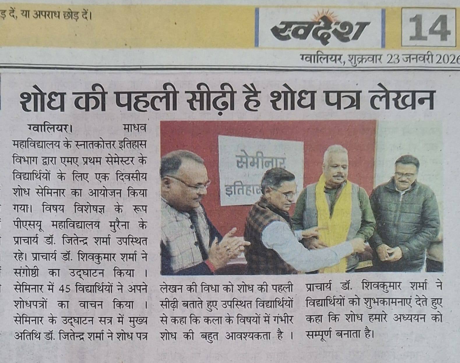 21जनवरी 2026 को स्नातकोत्तर इतिहास विभाग में MA 1st sem.के विद्यार्थियों के लिए एक दिवसीय research seminar का आयोजन किया गया 21-01-2026