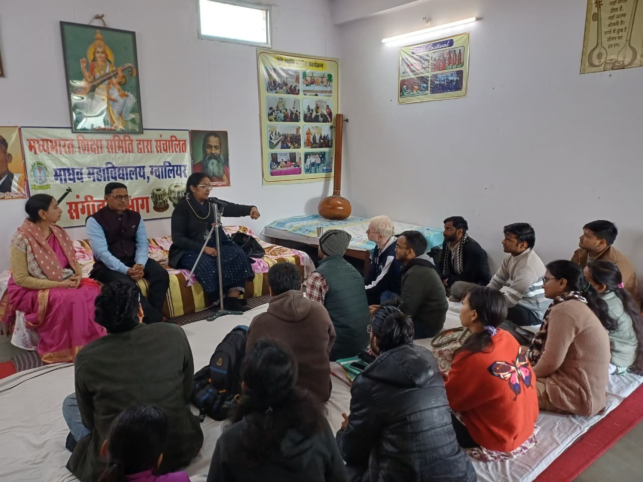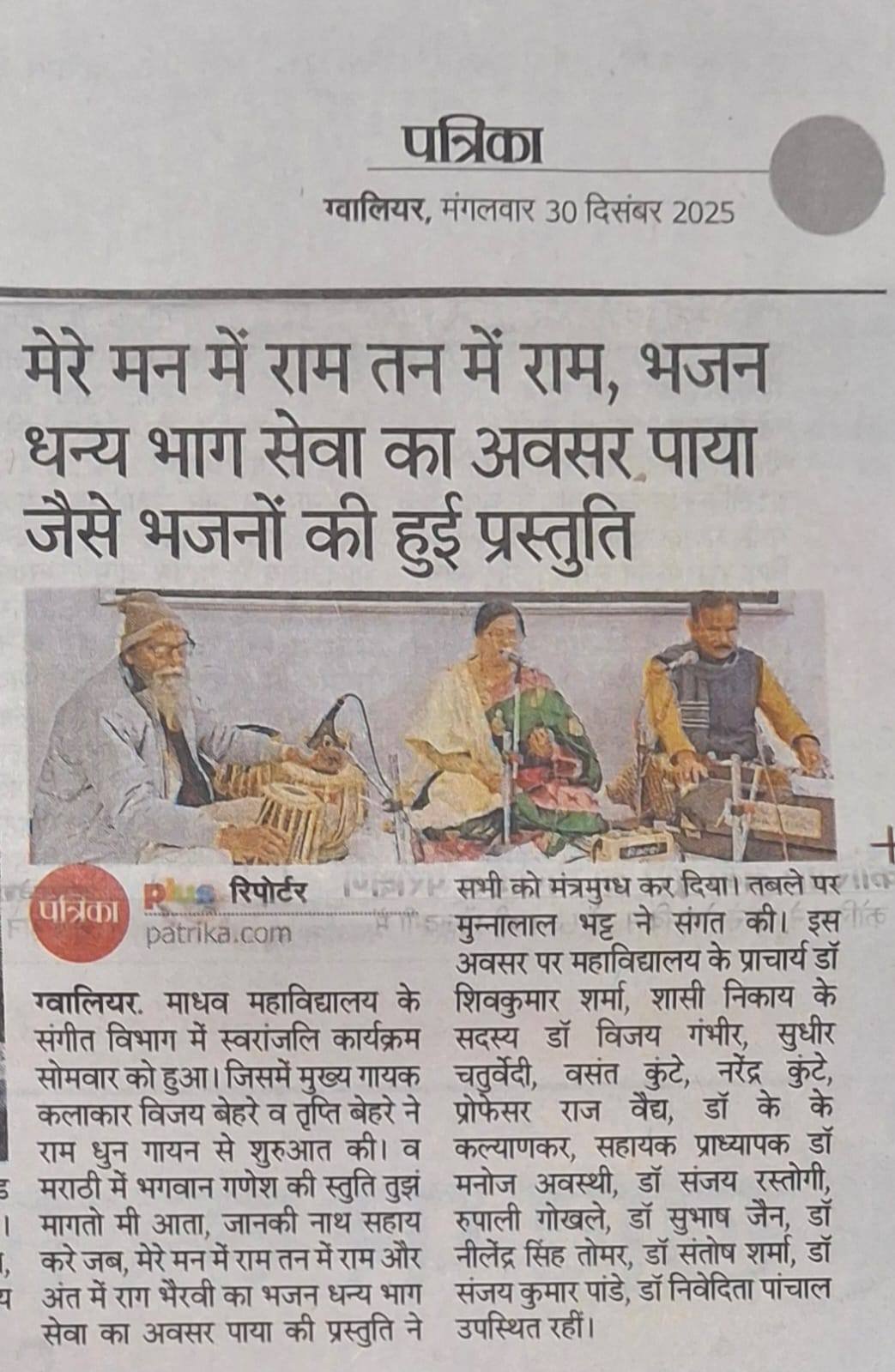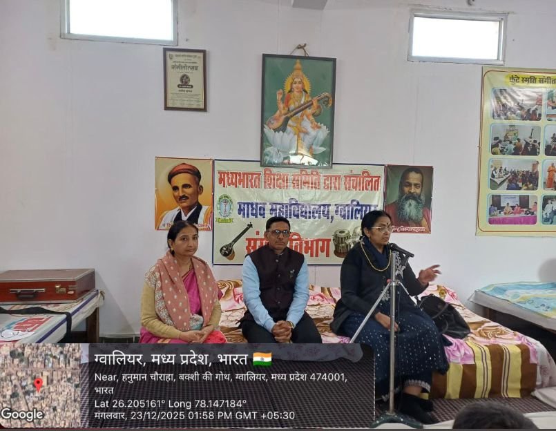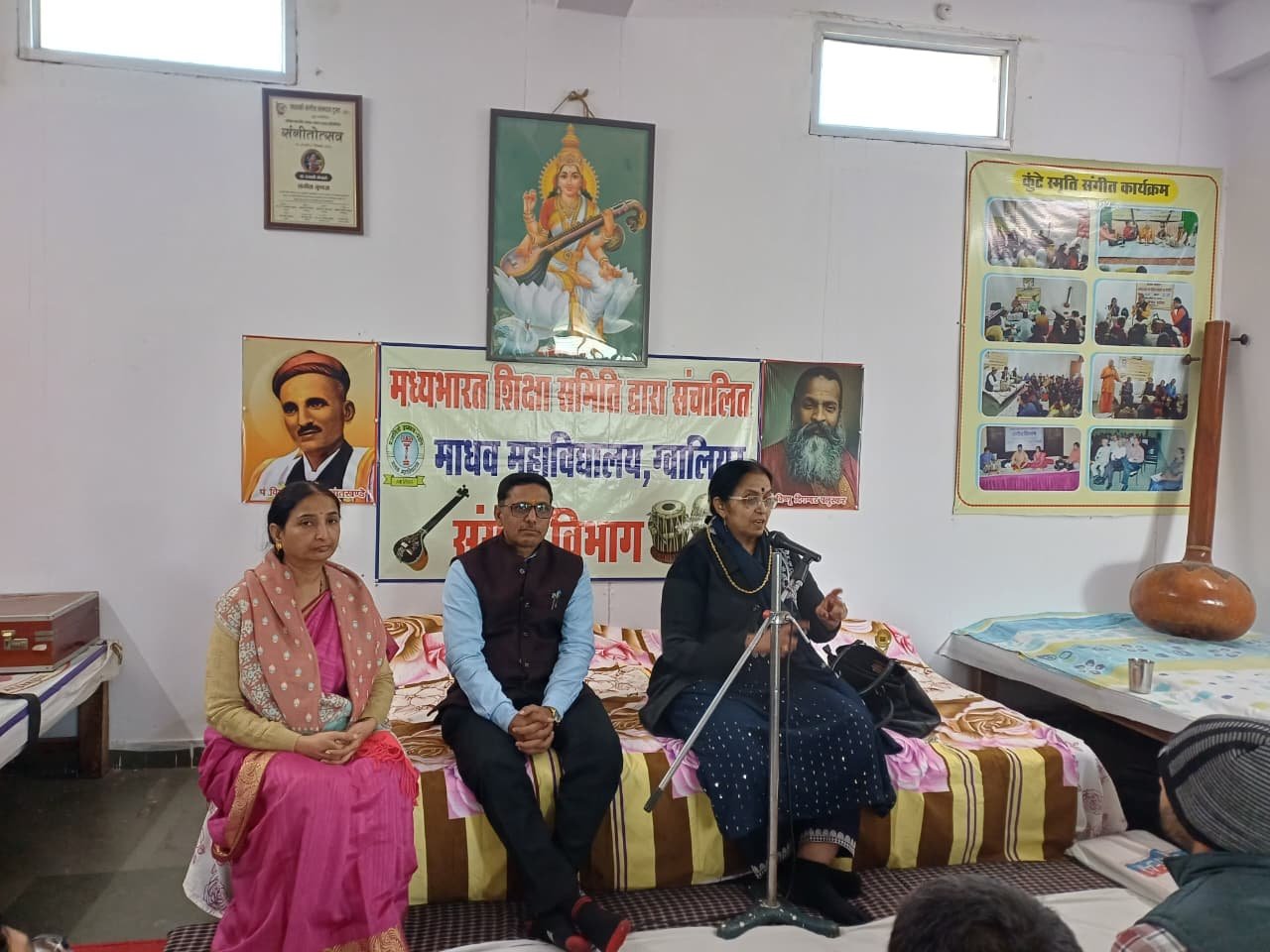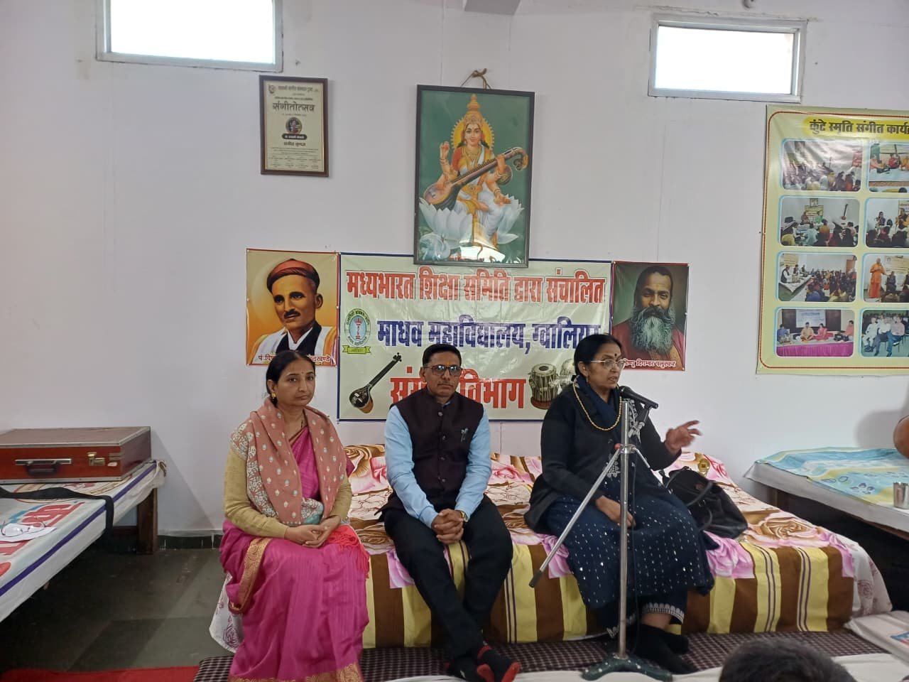 माधव महाविद्यालय के संगीत विभाग में "भारतीय ज्ञान परंपरा में ध्रुवपद संगीत परंपरा के अंतर्गत संवाद" कार्यक्रम का आयोजन किया गया, जिसमें मुख्य अतिथि एवं वक्ता ध्रुवपदाचार्य पद्मश्री पंडित लक्ष्मण भट्ट तैलंग जी की पुत्री एवं शिष्या विदुषी प्रोफेसर डॉक्टर मधु भट्ट तैलंग जी थीं 24-12-2025