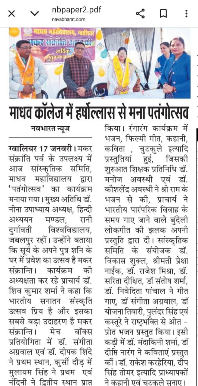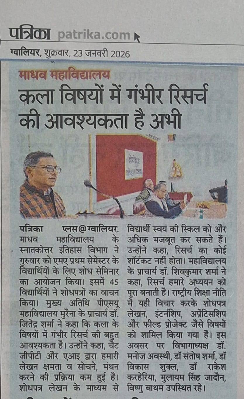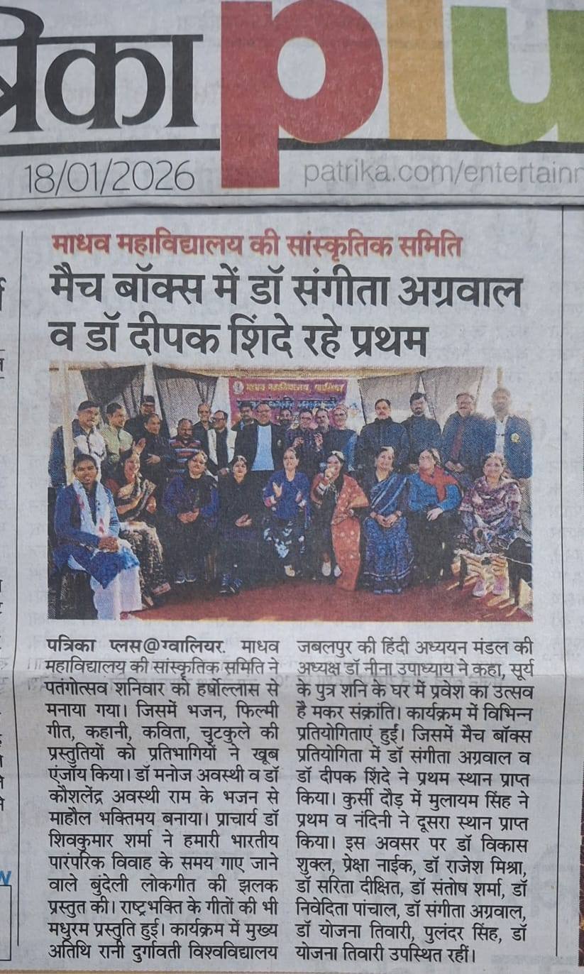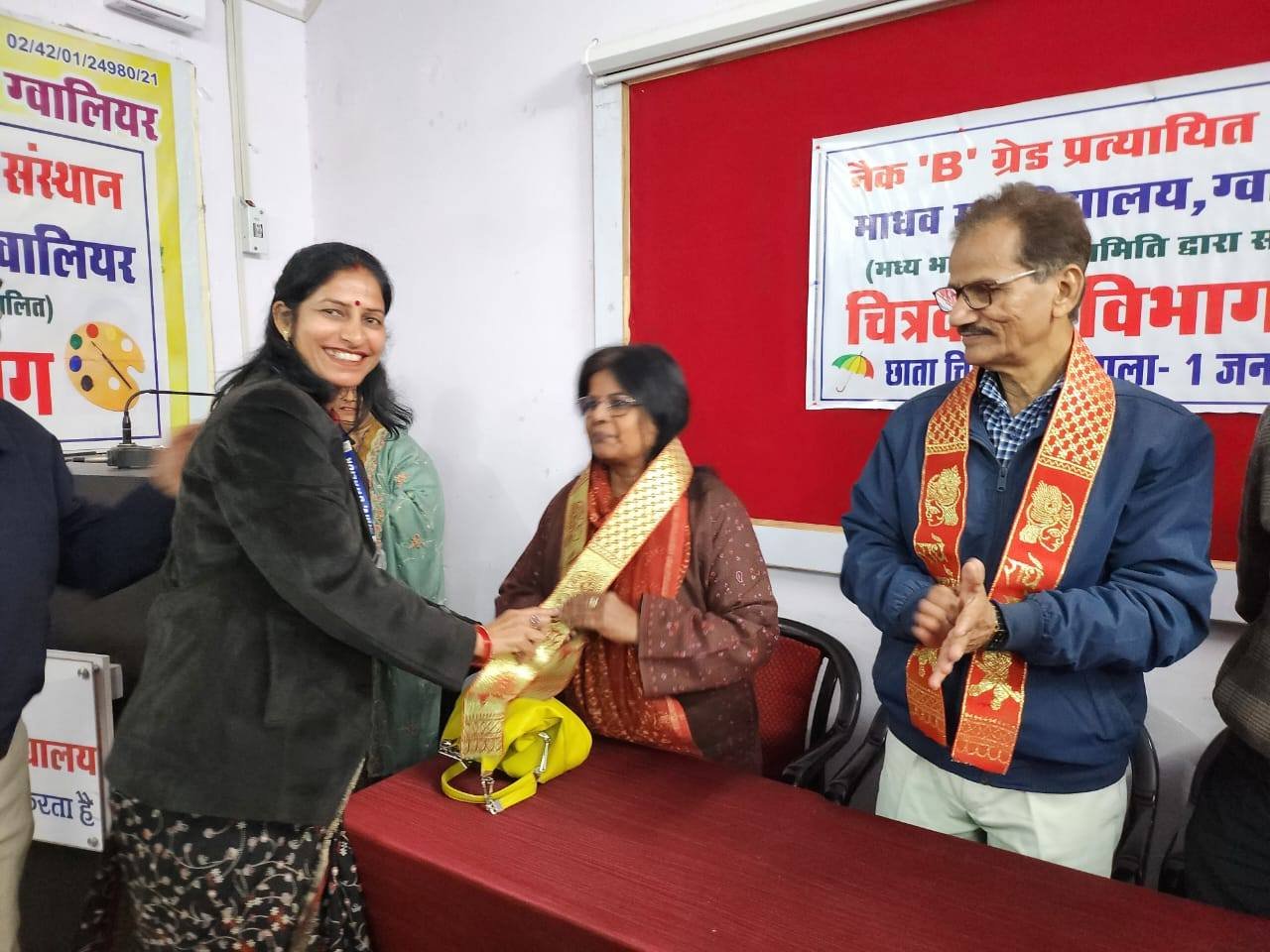 माधव महाविद्यालय के संगीत विभाग में "भारतीय ज्ञान परंपरा में ध्रुवपद संगीत परंपरा के अंतर्गत संवाद" कार्यक्रम का आयोजन किया गया, जिसमें मुख्य अतिथि एवं वक्ता ध्रुवपदाचार्य पद्मश्री पंडित लक्ष्मण भट्ट तैलंग जी की पुत्री एवं शिष्या विदुषी प्रोफेसर डॉक्टर मधु भट्ट तैलंग जी थीं 24-12-2025