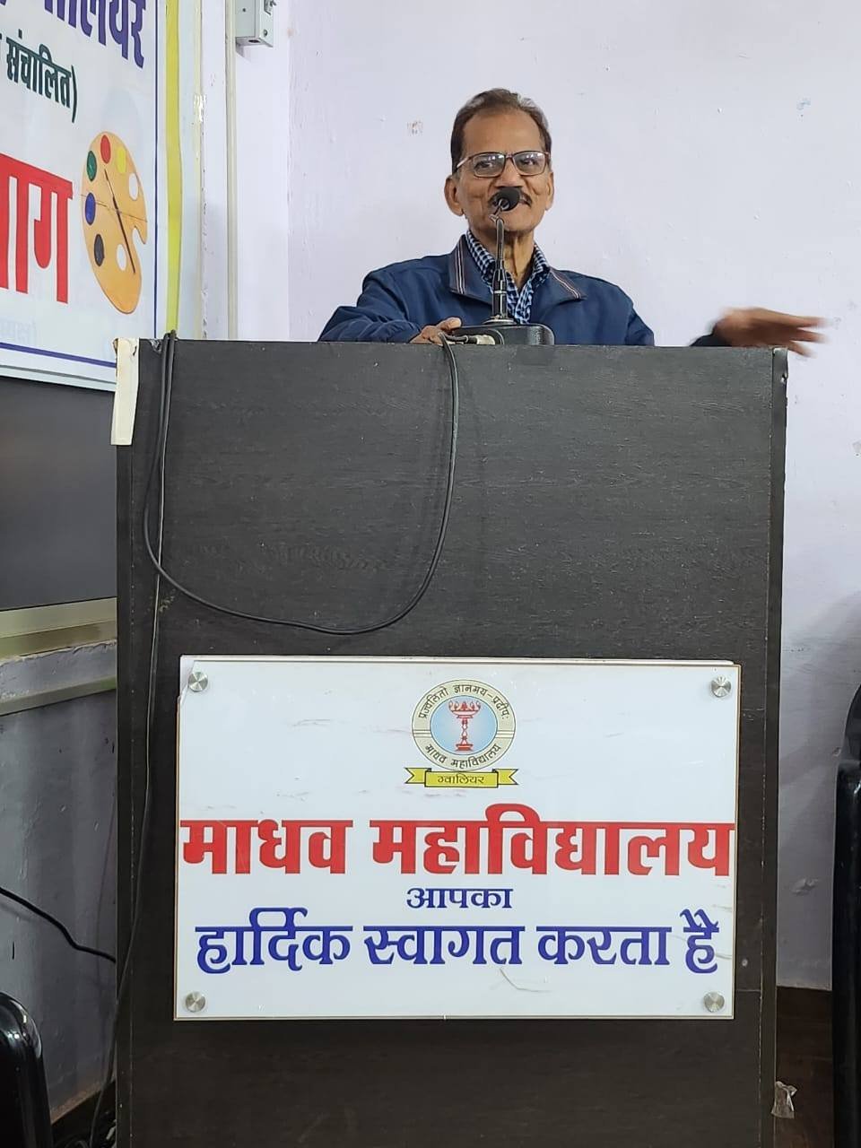 विश्व हिंदी दिवस के उपलक्ष्य में दिनांक 10 जनवरी 2025 को माधव महाविद्यालय के अटल सभागार में हिंदी विभाग द्वारा एक व्याख्यान का आयोजन किया गया। इस कार्यक्रम में मुख्य वक्ता हिंदी के प्रसिद्ध साहित्यकार डॉ. अवधेश कुमार चंसौलिया जी रहे 10-01-2025