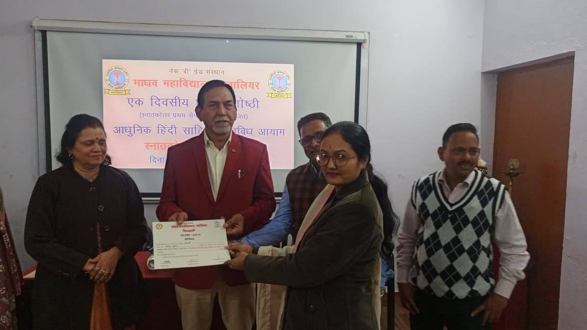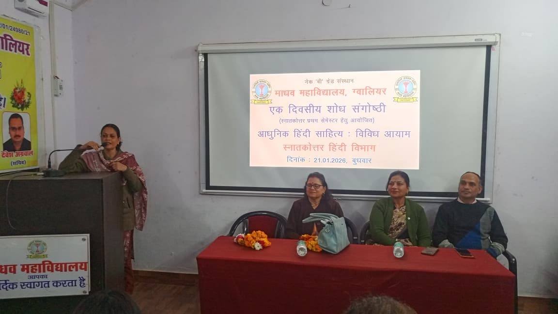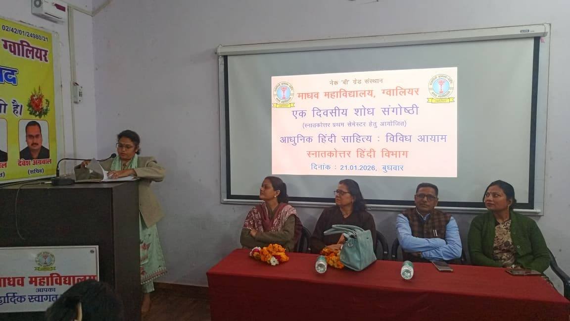 दिनांक 21 जनवरी 2026 को स्नातकोत्तर हिंदी विभाग में स्नातकोत्तर प्रथम सेमेस्टर के विद्यार्थियों के लिये 'आधुनिक हिंदी साहित्य:विविध आयाम' विषय पर एक दिवसीय शोध संगोष्ठी का आयोजन किया 21-01-2026