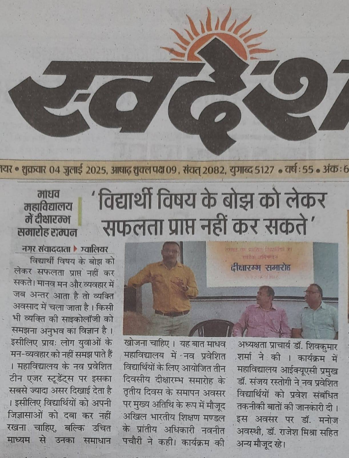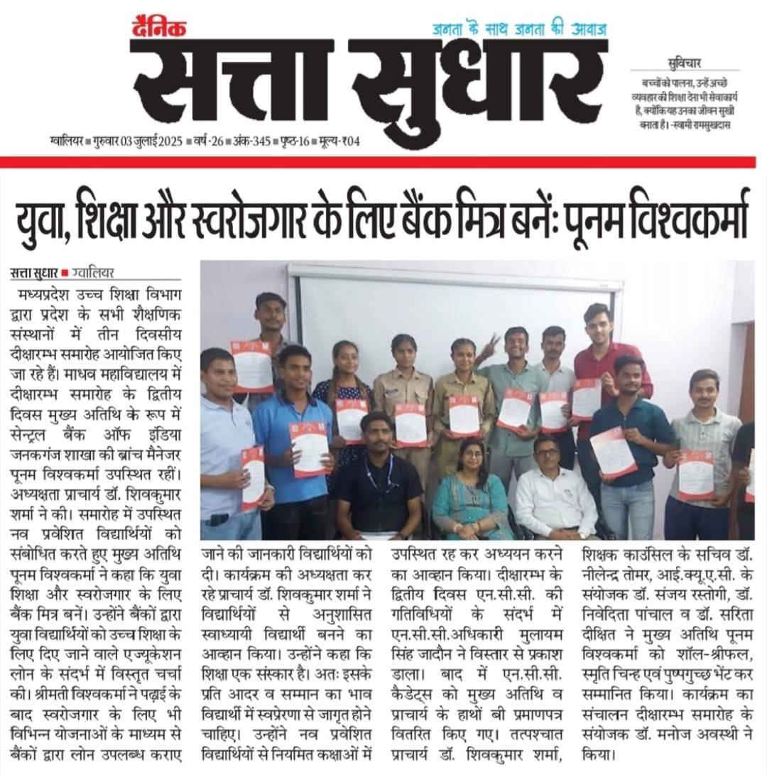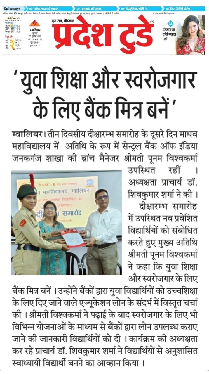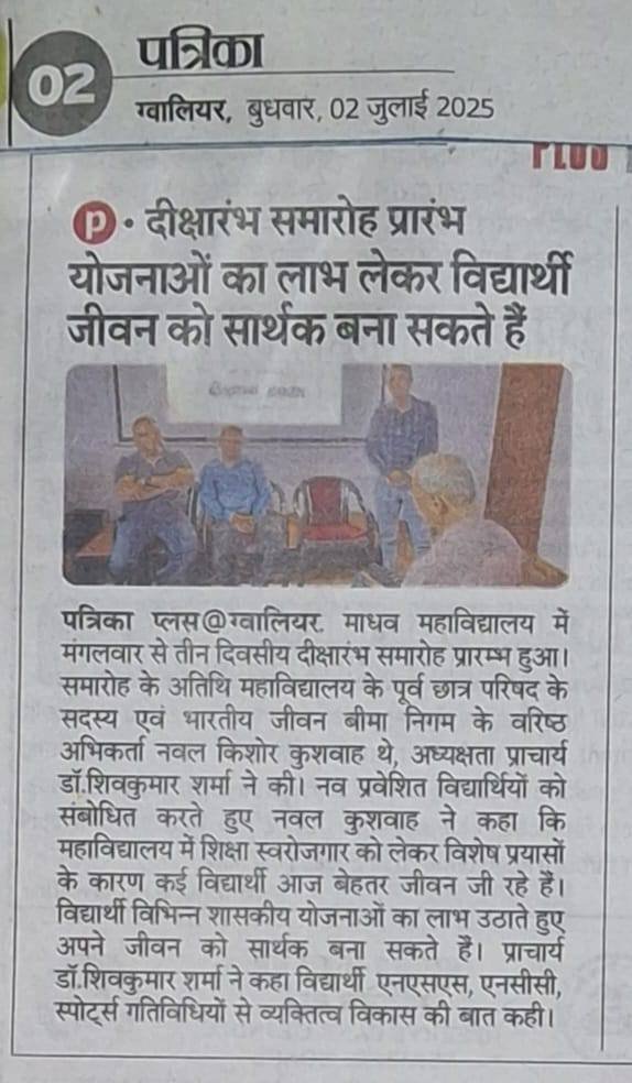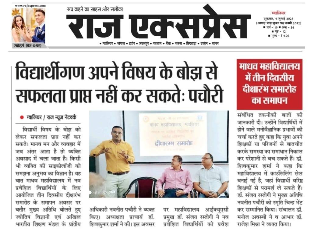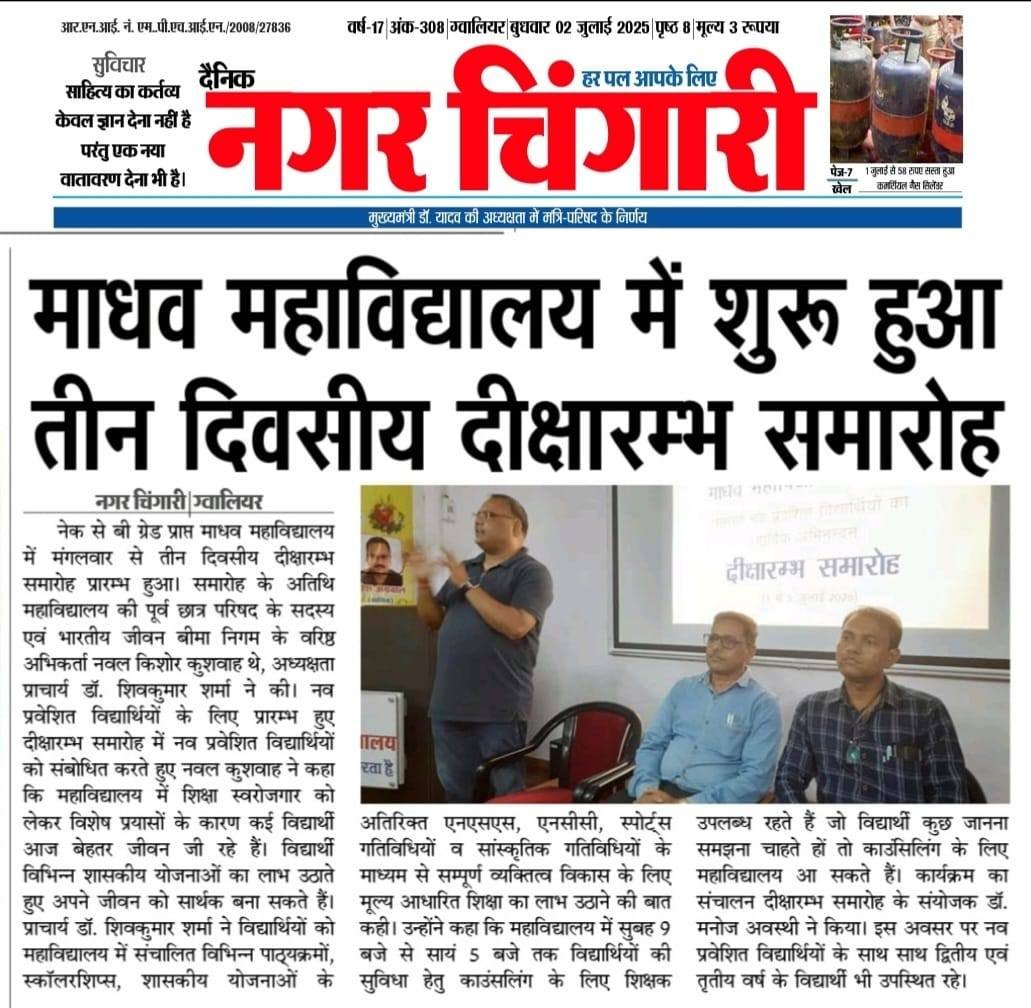 माधव महाविद्यालय में 1 जुलाई से 3 जुलाई तक हुआ तीन दिवसीय दीक्षारम्भ समारोह