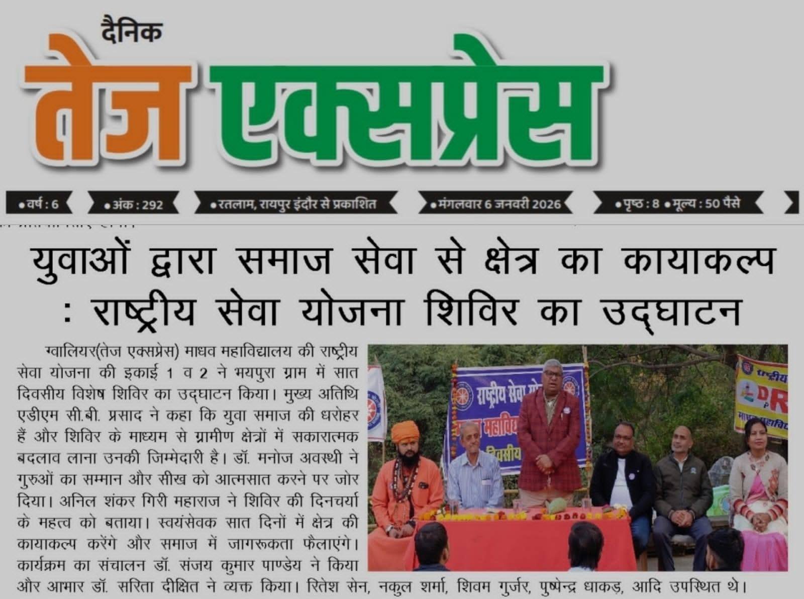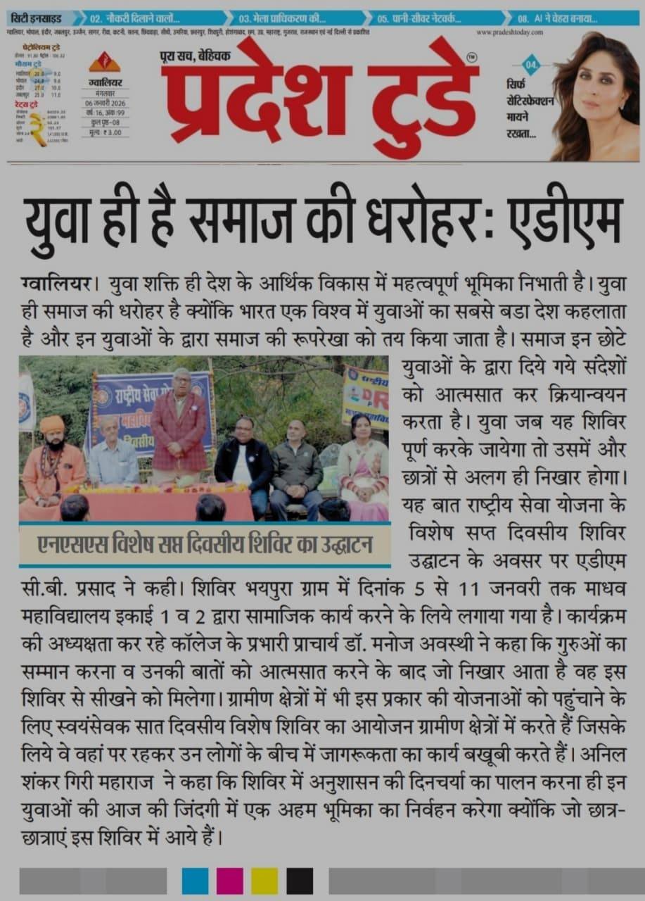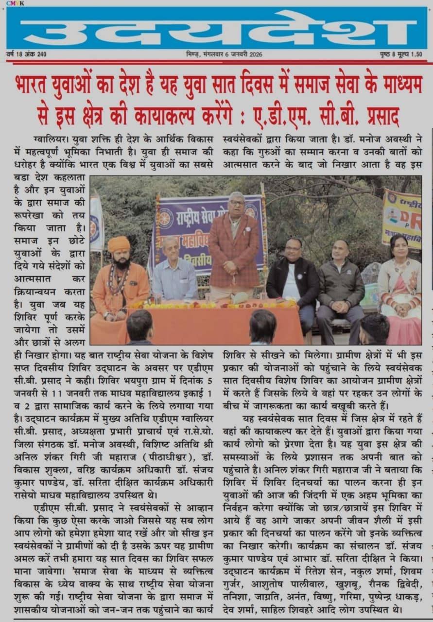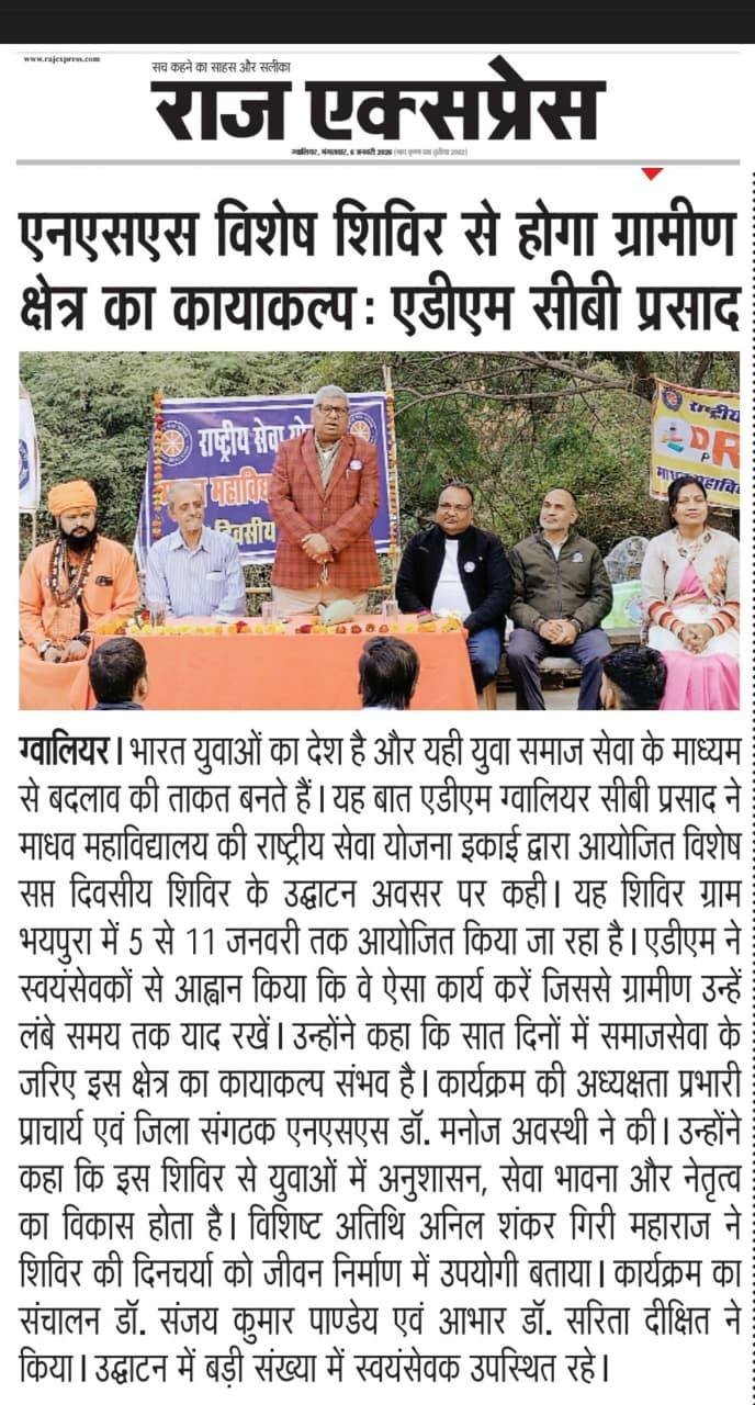 राष्ट्रीय सेवा योजना माधव महाविद्यालय विशेष सप्त दिवसीय शिविर का उद्घाटन